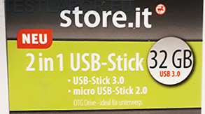 Der Hersteller des store.it 2 in 1 Stick wirbt auf der Verpackung mit USB 3.0! Dieses System wird besonders dann wichtig, wenn große Datenmengen übertragen werden sollen. Manche Hersteller werben mit „Übertragungsgeschwindigkeiten von bis zu 100MB/Sek“. Die Betonung liegt hierbei auf „bis zu“, denn viele USB-Sticks werden dieser Rate nicht gerecht. Rossmann schreibt nichts dergleichen, was wir gut finden, denn nicht überall wo USB 3.0 draufsteht, ist auch die volle Höchstgeschwindigkeit drin. Ohne den dazu passenden schnellen Computer mit genügend Speicher ist die Übertragung nicht schneller als mit einem 2.0 USB-Stick, was in vielen Fällen immer noch völlig ausreichend ist. Hinzu kommt, dass USB 3.0 nicht von jedem Gerät unterstützt wird. Fehlt die entsprechende Schnittstelle oder der jeweilige Treiber, wird aus USB 3.0 schnell eine Enttäuschung.