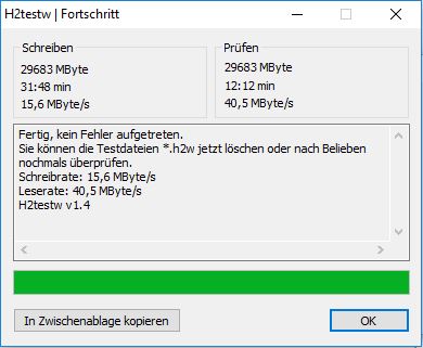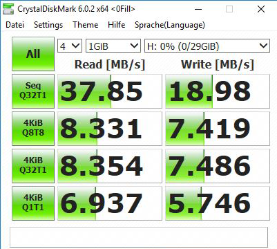 Wir wollen jedoch das Beste aus dem Produkt herausholen und testen die Übertragungsgeschwindigkeit an einem dazu passenden USB 3.0 Anschluss am PC. Unser Testsystem besteht aus einem 64 Bit Betriebssystem mit Windows 10, einem Intel Core i7 3770 CPU mit 3,4 GHz sowie 16 GB RAM. Wir überprüfen die genaue Lese- und Schreibgeschwindigkeit mit den Benchmark-Programmen CrystalDiskMark und H2testw sowie im normalen Gebrauch.