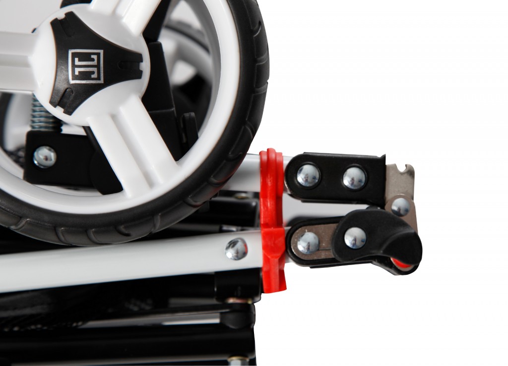 In Sachen Komfort lässt JOLINO etwas zu wünschen übrig. Wir vermissen Polsterungen, sowie eine ordentliche Federung. Besonders viel Bewegungsfreiheit hat das Kind ebenfalls nicht. Dafür gibt es ein Trittbrett. Die Rückenlehne lässt sich in einem 45° Winkel nach hinten neigen. Weiter geht es nicht, da sich dort die Metallverstrebungen befinden. Für mehr Sicherheit sorgen der 5-Punkt Gurt, sowie zwei Feststellbremsen an den Hinterrädern. Wie bereits erwähnt sind die Gelenkverbindungen alles samt gut gesichert. Diese erweisen sich im Test als äußerst zuverlässig.