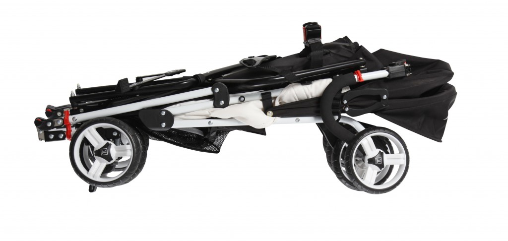 Nun wollen wir uns aber mit dem Test-Buggy JOLINO befassen. Bereits nach dem ersten Auspacken bemerken wir die Leichtigkeit dieses Buggys! Nur 6,6 kg bringt der Buggy auf die Waage und misst zusammengeklappt 80 x 25 x 28 cm. Somit ist er im zusammengefalteten Zustand extrem klein. Das Ganze ermöglichen neue Gelenkverbindungen an den Griffen und Rädern. Unser erster Test gilt also dem Auf- und zuklappen des Buggys.