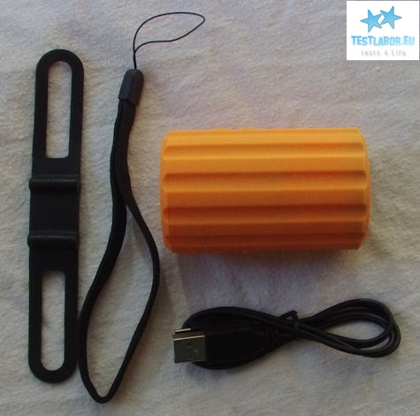 Der ca. 100g leichte Mini Bike Bass Lautsprecher von Jay-tech kommt mit folgendem Zubehör ins Haus: USB-Kabel, Trageschlaufe, Lenkradhalterung und Anleitung. Unser Mini Bike Bass Testmodell ist in Orange (Weitere Farben: Rot, Grün und Schwarz)  und wirkt modern und solide. Die Gummiummantelung bietet sowohl in der Hand, als auch auf glatten Oberflächen einen guten Halt.  Unter der Gummischicht befindet sich das Hartplastikgehäuse. Als Anschlussmöglichkeiten gibt es microSD, miniUSB und 3,5mm Klinke (Kopfhörer). Letzterer dient nur als Line Out. Line-In via Audiokabel ist nicht möglich, ebenso wenig wie Bluetooth.