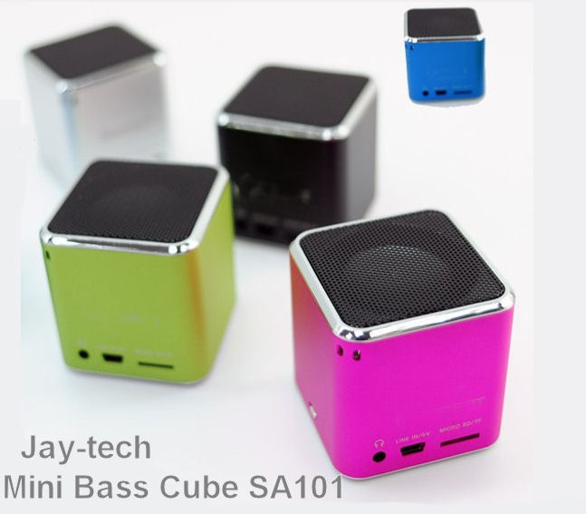 Der Mini-Lautsprecher Mini Bass Cube SA101 sieht aus wie ein etwas zu groß geratener Eiswürfel, doch dieser scheint es in sich zu haben. Das Gehäuse befindet sich aus gebürstetem Aluminium. Den SA101 gibt es in Silber, Schwarz, Grün und Pink. Unser Testmodell ist in Silber. Der Mini Bass Cube wirkt sehr robust und hochwertig. Als Anschlussmöglichkeiten gibt es Kopfhörer, Mini USB und microSD Slot. Zudem gibt es noch die wichtigsten Bedienelemente eines MP3 Players, wie Play, Pause, Spulen und Laustärke.