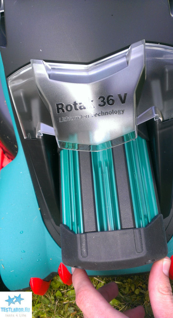 Vor dem ersten Start müssen wir die Akkus voll aufladen, denn im Auslieferungszustand sind nur teilgeladen geliefert. In rund einer Stunde ist ein Akku voll aufgeladen. Es kann immer nur ein Akku eingesetzt werden, dafür haben beide eine Ladezustandanzeige. Gestartet wird der LI 43 am Griff, vorausgesetzt der Akku wurde vorher eingesetzt der Stromkreisunterbrecher auf Position I gestellt. Der Mechanismus ist so eingestellt, dass der Motor nur läuft, wenn ein Schalter am Griff gedrückt wird. Einmal losgelassen bewirkt das Ausschalten, doch Vorsicht, die Klinge dreht sich danach noch einige Sekunden weiter. Es gibt nur eine Leistungsstufe. In dieser erreicht der Rotak 43 LI erreicht einen Schalldruckpegel 76 dB(A). Dies entspricht in etwa dem Geräusch eines Pkw in 10 Meter Entfernung. Die Lautstärke ist erträglich und natürlich weitaus leiser als bei Benzinrasenmähern. Zudem kommt hinzu, dass hier kein störender Benzingeruch hinzukommt.