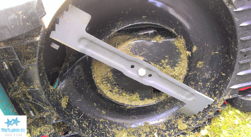 Der Testrasen misst rund 50m² und weist hohes Gras und jede Menge Beikraut auf. Bevor der Tester loslegt, muss erst einmal die Schnitthöhe eingestellt werden. Hierzu stehen ihm 6 Stufen zur Auswahl. Diese reichen von 20 mm bis 70 mm. Das Einstellen verläuft- wie eingangs schon erwähnt- einfach und schnell am Hebel auf der linken Seite. Der Schnitthöhenverstellhebel ist griffig und ermöglicht eine einfache Verstellung. Ob vor- oder rückwärts, der Rotak LI 43 ist leicht und erweist sich auf dem Testrasen als wendig. Kein Wunder, bewegt man hier lediglich 14 kg durch die Gegend. Kein Vergleich zu einem Benziner oder anderen Akku-Rasenmähern dieser Klasse. Der LI 42 mäht souverän und gleichmäßig. Auch in Hanglage und unter Bäumen lässt es sich mit dem LI 43 gut mähen. Bereits nach den ersten Metern bemerkt der Testproband eine hervorragende Schnittleistung. Dies ist wohl den gehärteten Stahlmessern und der innovativen Luftstromtechnologie zu verdanken. Das Powerdrive LI + System liefert konstant hohes Drehmoment bei allen Testbedingungen. Selbst unter schwierigen Bedingungen erhalten wir einen zuverlässigen Schnitt. Zudem mäht der Rasenkamm das Gras im Test fast bis an die Kante. Dank der LeafCollect-Funktion sind auch Laub und Blätter für den LI 43 kein Problem. Was bei diesem Rasenmäher noch das i-Tüpfelchen wäre, ist der Radantrieb, doch bei diesem Leichtgewicht und einfachen Handling ist diese Funktion eigentlich nicht notwendig.