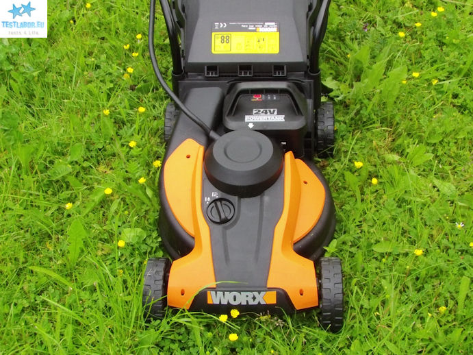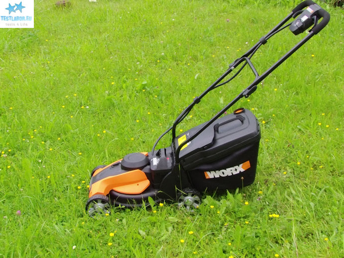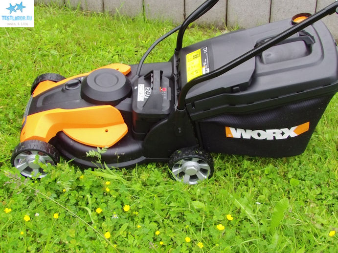 Die Testsituation: Unsere Rasenfläche misst ca. 50m² und weist hohes Gras und jede Menge Unkraut auf. Bevor unser Tester loslegt muss erst einmal (natürlich im ausgeschalteten Modus) die Schnitthöhe eingestellt werden. Hierzu stehen drei Stufen zur Auswahl. Diese reichen von 20mm bis 60mm. Das Einstellen benötigt etwas Geschicklichkeit. Jetzt geht’s dem Rasen an den Kragen. Der Worx WG783E lässt sich kinderleicht schieben. Kein Wunder, bewegt man hier nur 14 kg durch die Gegend. Nach dem ersten Drittel der Rasenfläche ist der Grasbeutel bereits voll. Das Ausleeren erweist sich als einfach und schnell. Weiter geht’s. Der WG783E mäht alles platt was ihm in die Quere kommt. Ob Mute oder Turbo, der WG783E mäht souverän und gründlich! Am effektivsten ist der Turbo-Modus. In weniger als 10 Minuten ist der Garten gemäht und der dritte volle Grasbeutel ausgeleert. Im Test stellt sich heraus, dass 20mm Schnitthöhe perfekt sind. Wir bemerken keinen Unterschied zum Benzin-Rasenmäher, der eine Woche zuvor getestet wurde.