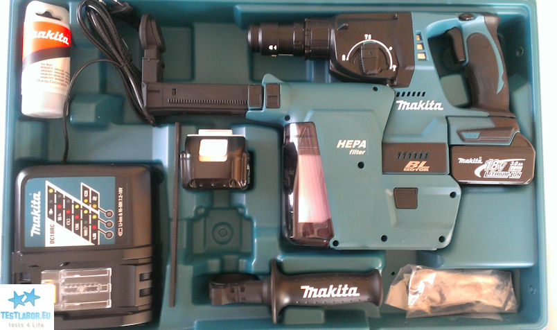 und Ladegerät geliefert. Somit ist unser Test-Set BHR243RFEV das Umfangreichste von allen. Als Lieferumfang gibt es sogar gleich zwei Akkus, ein Schnelladegerät, den robusten Transportkoffer, einen Seitengriff, sowie Tiefenanschlag und Schnellwechsel-Bohrfutter für zylindrische Bohrer. Einzeln wiegt der Bohrhammer 3,4 kg.