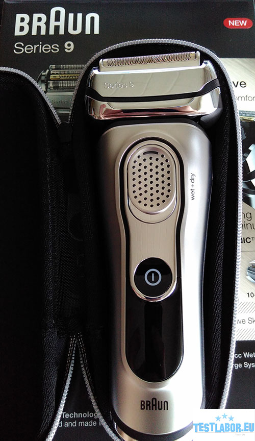 Das Netzteil versorgt wahlweise die Reinigungsstation oder den Rasierer. Bei einem direkten Anschluss an den Rasierapparat kann der Series 9 jedoch nicht betrieben werden. Das ist auch gut so und hat sicherheitstechnische Gründe, da der Braun Rasierer auch unter Wasser gehalten werden kann. Er ist sogar bis zu fünf Meter wasserdicht. So können wir den Braun Series 9 im Test ganz einfach unter fließendem Wasser abspülen oder ihn unter der Dusche benutzen. Natürlich darf man dies nicht tun, wenn der Netzstecker eingesteckt wurde. Hier hat Braun sehr gut mitgedacht und daher ist dieser Lock eine sehr gute Sache.  Auch sehr schön ist die Clean&Charge Station. Diese Docking-Station ist die weltweit einzige 5-Stufen Station auf Alkoholbasis und entfernt laut Hersteller 99,999 % aller Keime und Bakterien auf Knopfdruck. Die Clean&Charge Station lädt, pflegt und trocknet Ihren Rasierer dazu noch vollautomatisch. In das mitgelieferte Etui passt neben dem Rasierer nur noch die Reinigungsbürste jedoch nicht das Netzkabel, geschweige denn der Stecker. Was zudem fehlt ist eine Schutzabdeckung für den Scherkopf.