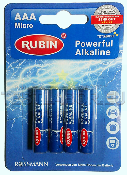 Batterie Test 07/2014: RUBIN Powerful Alkaline von Rossmann Testbericht (5 DIN A4 Seiten) in PDF Form.