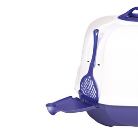 Das doppelte Randprofil verhindert das Austreten von Katzenstreu, Urin und Kot. Das zeigen auch die Langzeit-tests, in denen auch zwei Katzen die Toilette benutzen. Dank des hohen Randes und der Klappe bleibt das Holzstreu immer schön da wo es ein soll. Die Easy Click-Verschlüsse sollen zum schnellen Öffnen und Verschließen der Toilette beitragen. Im Test verläuft das im Großen und Ganzen ganz gut. Es ist nur etwas umständlich, dass die Verschlüsse dabei fast jedes Mal aus der Verankerung springen. Das Ablagefach für die mitgelieferte Streuschaufel ist hingegen sehr praktisch.